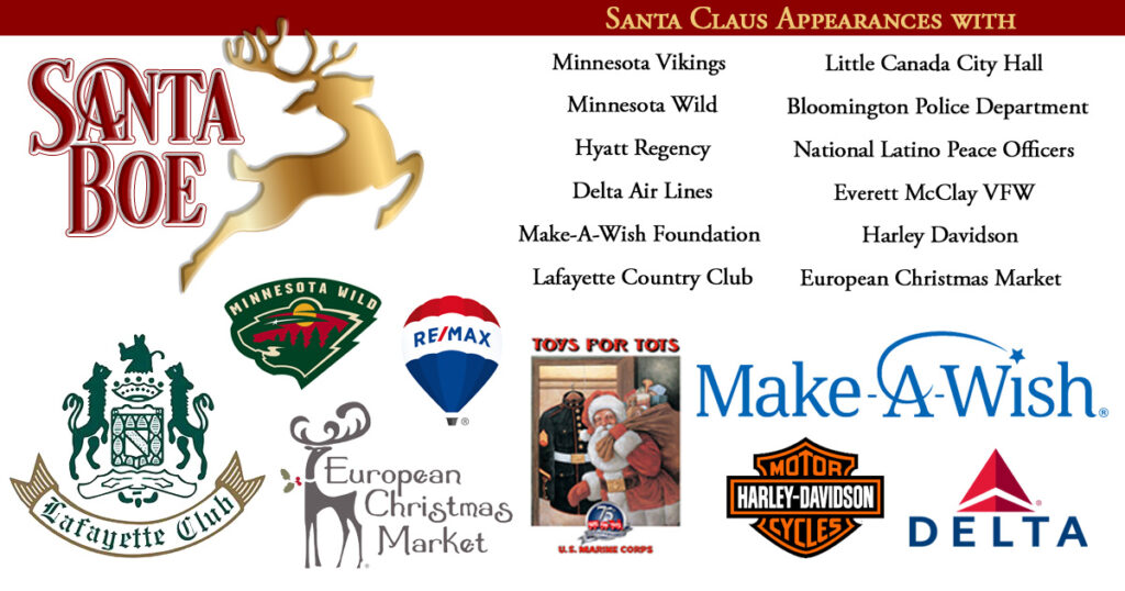 Bring the spirit of Christmas magic to your event, home, party, or gathering by inviting a visit from Minneapolis’ premiere Santa Claus – Santa Boe! Choose from three looks – Traditional, GQ, or Viking Santa!